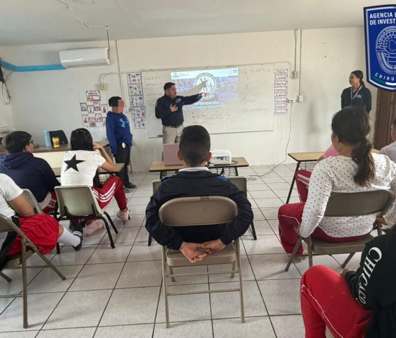 Elementos del Grupo de Orientación Escolar Chihuahuense (GOECHI), de la Agencia Estatal de Investigación (AEI) y la Fiscalía de Distrito Zona Noroeste, llevaron a cabo una intervención formativa en la Escuela Primaria Francisco I. Madero, en Nuevo Casas Grandes.