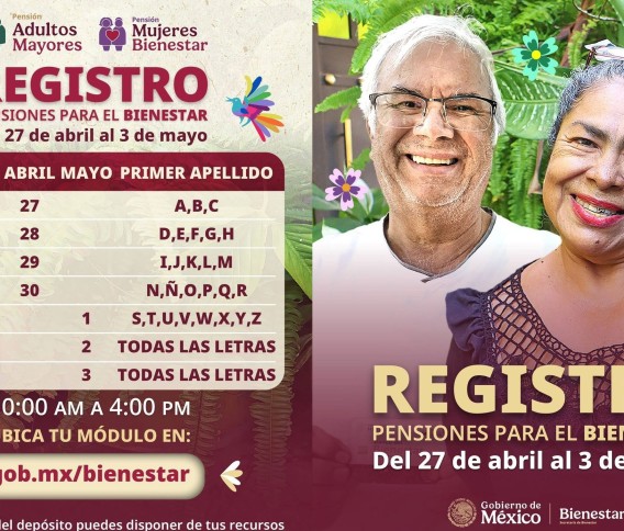 La enlace de Comunicación, Ximena Chávez, informó que del 27 de abril al 3 de mayo se llevará a cabo el periodo de registro para las Pensiones del Bienestar de Adultos Mayores y Mujeres Bienestar.